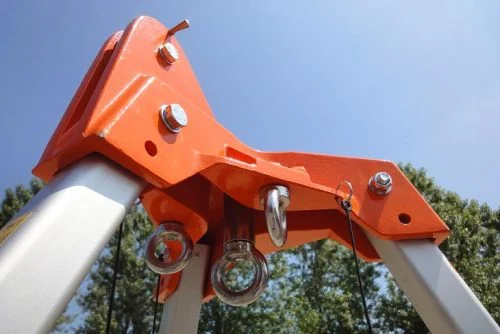 Het ingenieuze ontwerp van deze lichte driepoot in aluminium garandeert uitstekende veiligheid, een lange levensduur en veelzijdig gebruiksgemak. De kop heeft drie gecertificeerde, draaibare bevestigingsogen en een ‘over head’-bevestigingspunt. Aan de ogen verbindt u eenvoudig toestellen met verschillende veiligheidsfuncties (valbeveiliging, evacuatie, …) en ook tuikabels, die voorkomen dat de driepoot zou kantelen bij ‘over-the-edge’ reddingsacties. De breed uitgevoerde kop laat voldoende ruimte om er toestellen tussen te plaatsen. Een visuele rode indicator geeft aan wanneer de poten tijdens het verstellen te ver worden uitgeschoven, zodat borgen dan niet mogelijk is. De poten zijn telescopisch verstelbaar, wat handig is bij een lage opstelhoogte of mangaten die boven de vloer uitsteken.